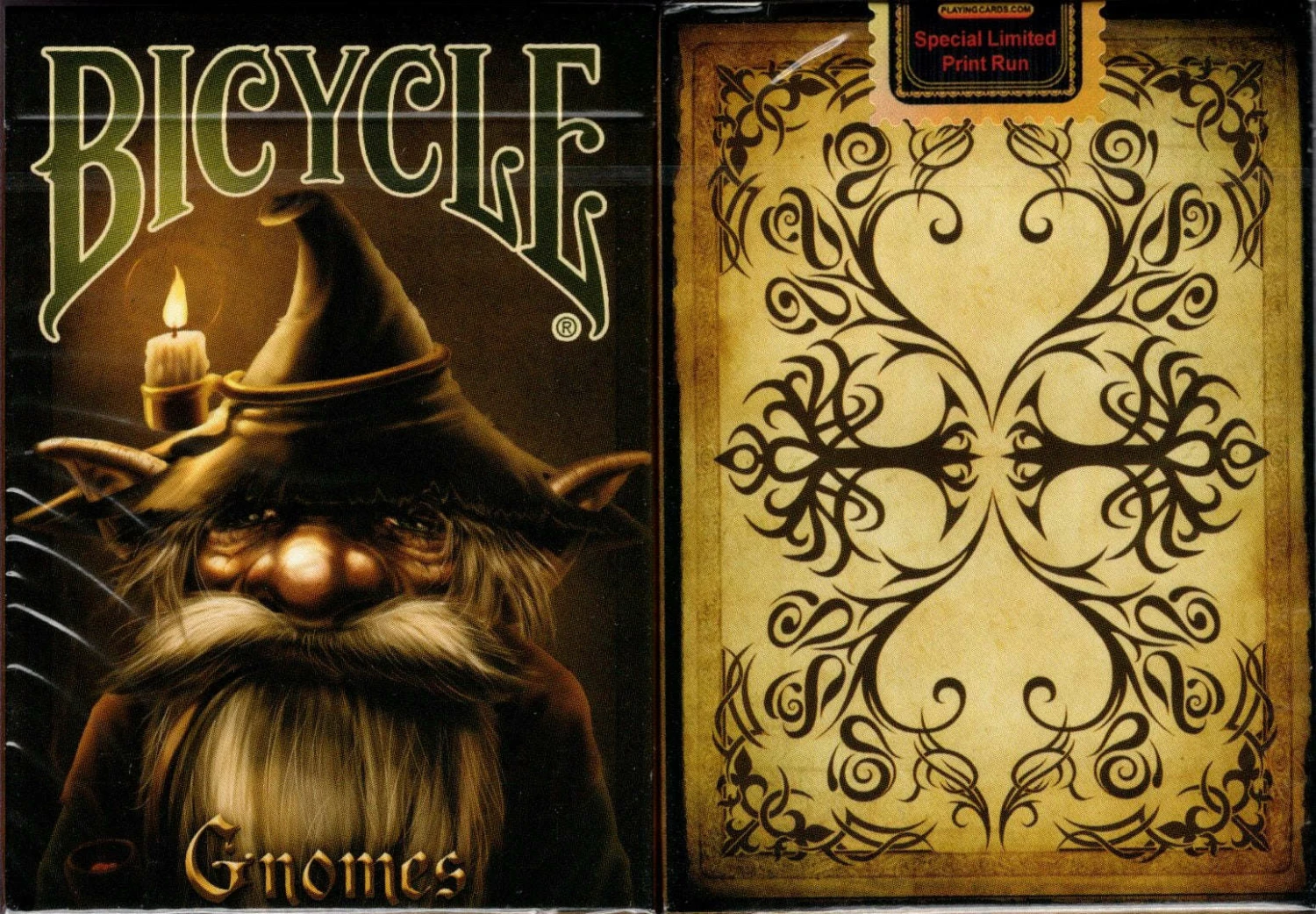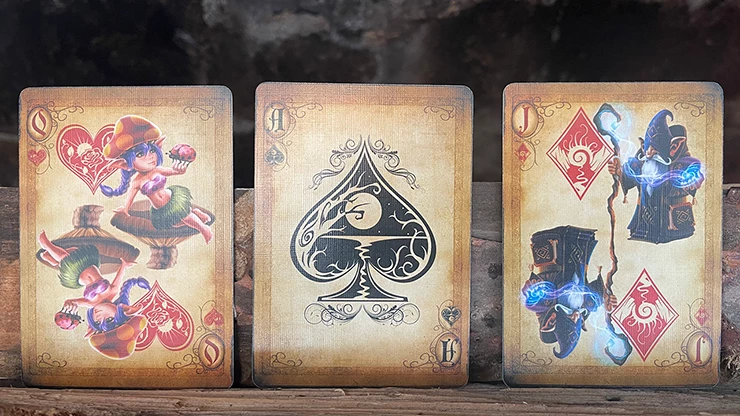 Attested from the early 18th century. Gnomes are used in Alexander Pope’s “The Rape of the Lock”. The creatures from this mock-epic are small, celestial creatures which were prudish women in their past-lives, and now spend all of eternity looking out for prudish women (in parallel to the guardian angels in Catholic belief). Other uses of the term gnome remain obscure until the early 19th century, when it is taken up by authors of Romanticist collections of fairy tales and becomes mostly synonymous with the older word goblin. 100% custom designed Bicycle playing card deck.