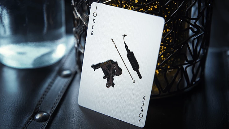 Two sharp bull-like horns, metallic eyes, and leering mouth are emblazened with gold foil on each card back. The tools of the trade are highlighted on the Jokers.
