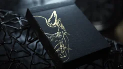 When looking straight ahead, the mask appears frightening and angry; when tilted slightly down, the face of the demon appears to be sorrowful, as though crying. In much the same way, the gold foil mask on the Hannya Playing Cards tuck case emerges from the black mat darkness and peers into your soul.