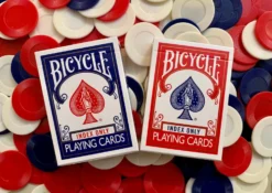 A very minimal Bicycle rider back deck with only indices on the faces. No pips, no court characters. This is essentially the exact opposite of our “Faro Edition” Bicycle deck we created a few years ago.