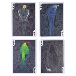 Every card has a unique illustration, with 1 to 10 parrots on it, corresponding with the card number. The courts are illustrated in the classic style with mirrored faces.