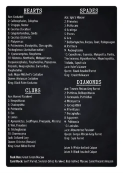 Nearly every genus from the Psittaciforme order is shown in the cards, which are organized by region.  The Spades show parrots from South America, The Hearts show parrots from Australia.  The Clubs feature parrots from Indonesia and the Pacific Islands, and finally, the Diamonds show parrots from Africa, mainland Asia, and the Philippines  (there’s a bit of overlap between the Clubs and Diamonds).