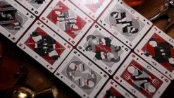 The Noir version features black and white tones that pay homage to the silver screen movies that turned the stories of the old west into legend. With a black tuck case highlighted by silver foil, this version represents a striking contrast. And of course, it includes the distinctive cutouts of its sister deck, allowing you to peek in on design elements of the cards within. The entire tuck is meant to be an experience to enjoy, capturing the feel of the buildings of the old west and giving you a truly unique way to enjoy your deck!