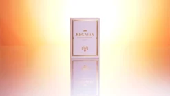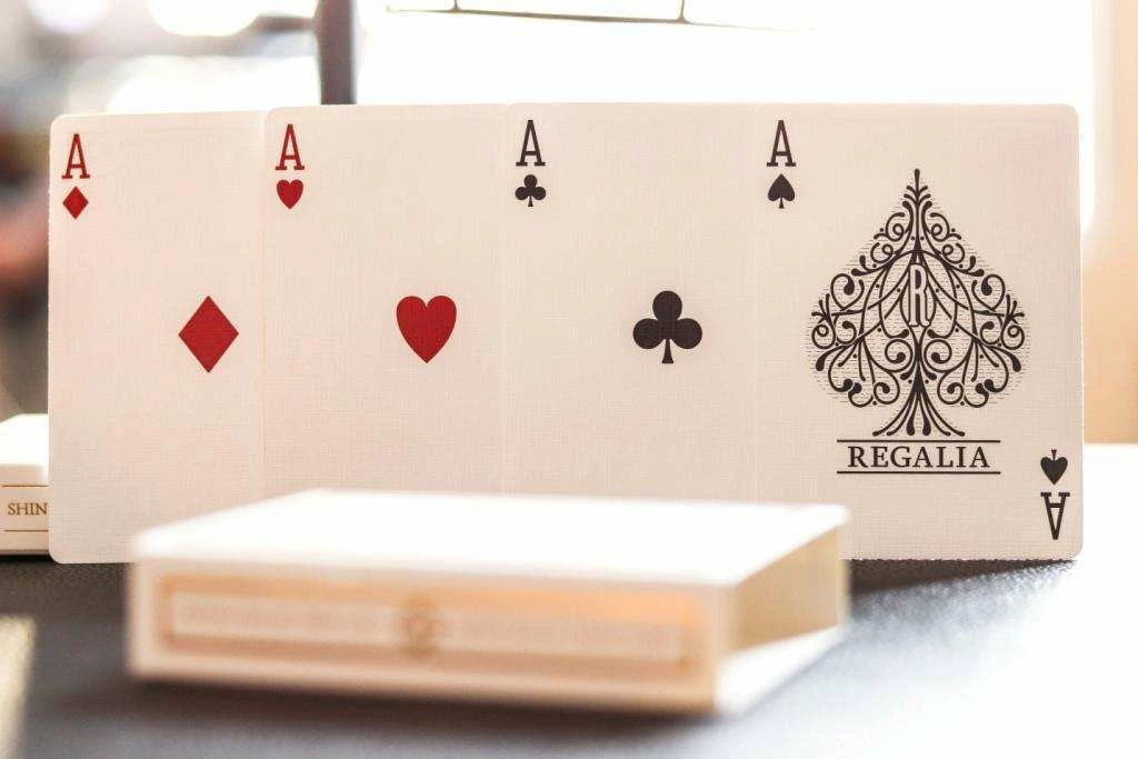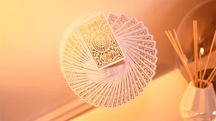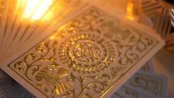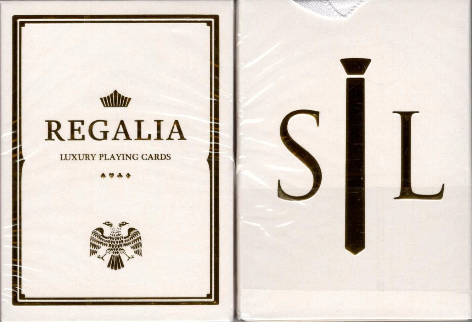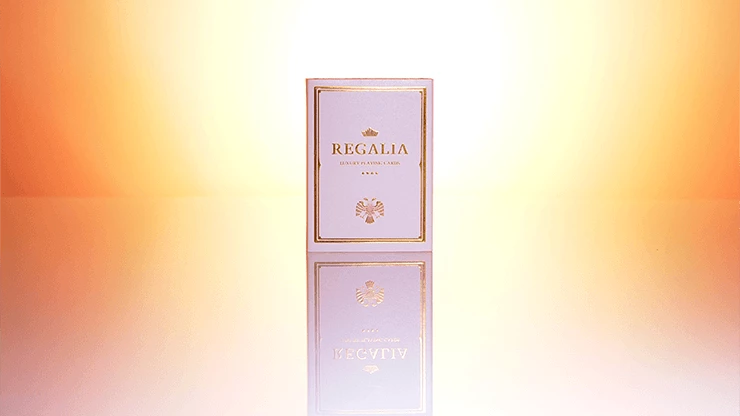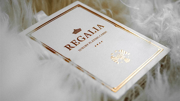 The box is made from two protective pearled white casings, with an inner and outer cellophane wrap. These individually gold-foiled cards are sealed to withstand any extreme heat or humidity during shipment. Our priority for the Regalia series has always been quality. Each card has been carefully hot stamped with gold foil and then protected with a true B9 finish, thus to not compromise the feel and fluidity with each shuffle or flourish.